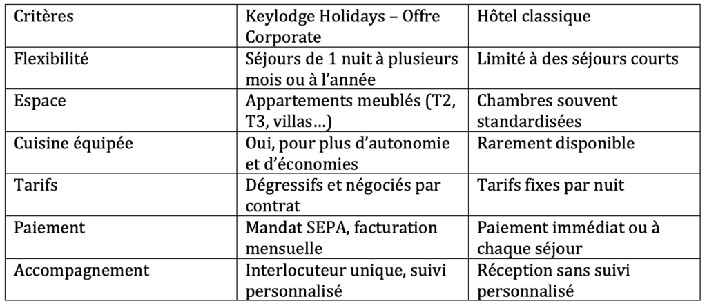 C’est pour répondre à ces enjeux que Keylodge Holidays a conçu son offre Corporate : une solution d’hébergement sur-mesure, pensée pour les besoins des professionnels, avec des tarifs préférentiels, une facturation centralisée, et un accompagnement personnalisé.